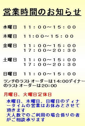 営業時間ランチ 11:00〜15:00 (L.O. 14:00)